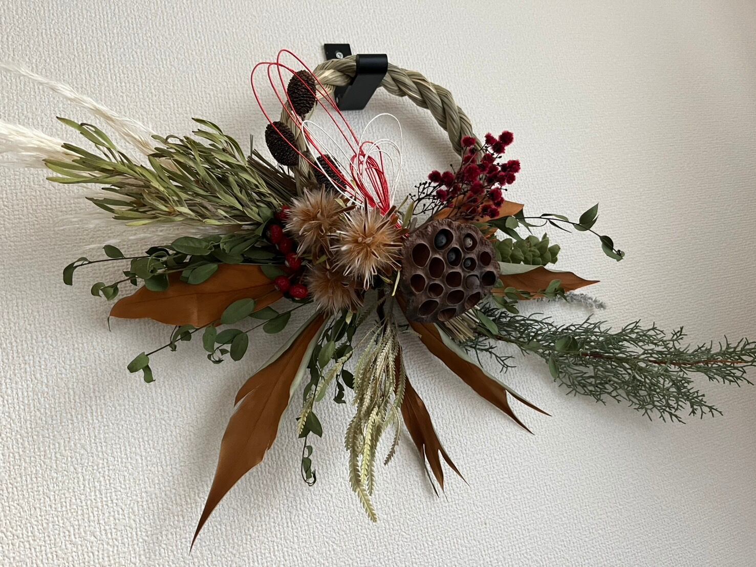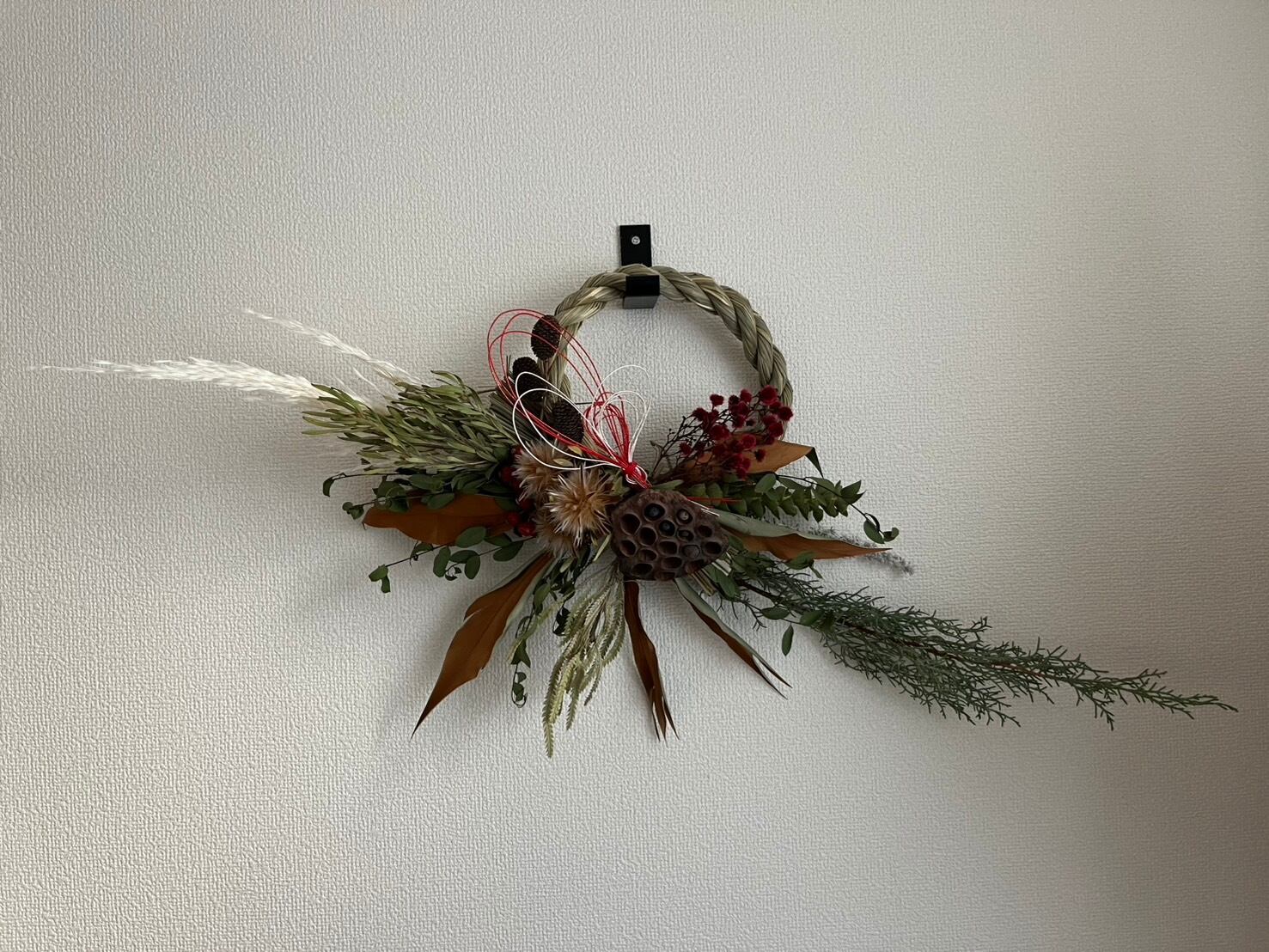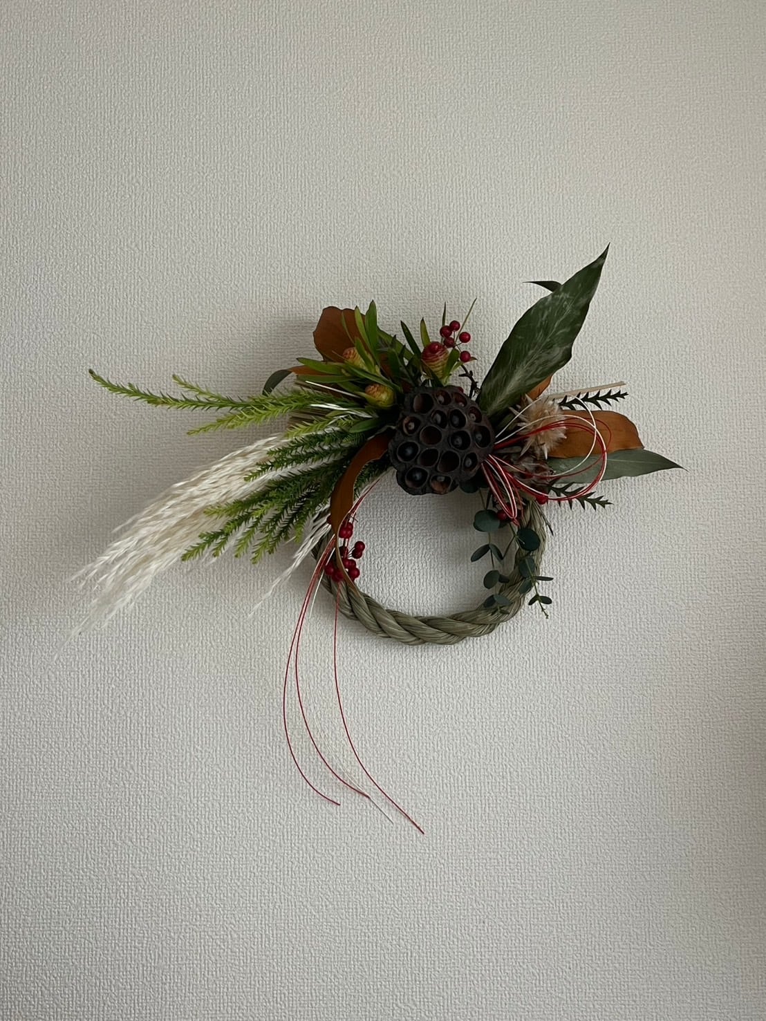 しめ縄(稲わら)をベースに、パンパスグラス・ブルーアイス・野ばら・蓮の実など、季節のドライフラワーや木の実、水引を組み合わせています。